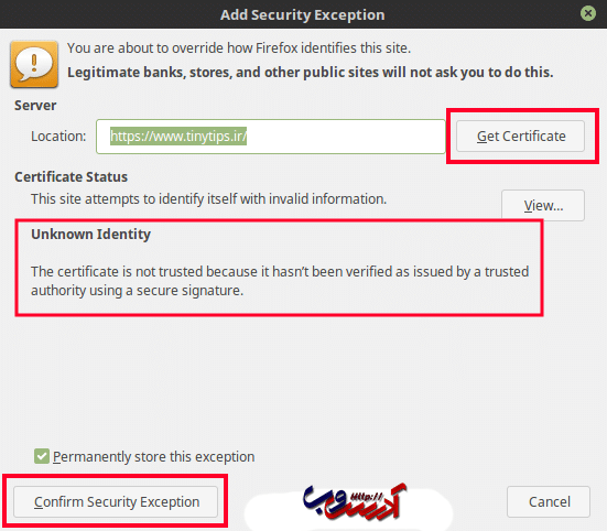 در این صورت فایرفاکس سعی میکند تا گواهینامه امنیتی SSL را به صورت دستی تایید کند که نتیجه این کار در کادر قرمز رنگی که با عنوان Unknown Identity در تصویر قرار دارد نمایش داده خواهد شد. حال در این مرحله کافی است روی دکمه Confirm Security Exception کلیک کنید تا ارور your connection is not secure در مرورگر فایرفاکس برطرف شود.